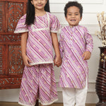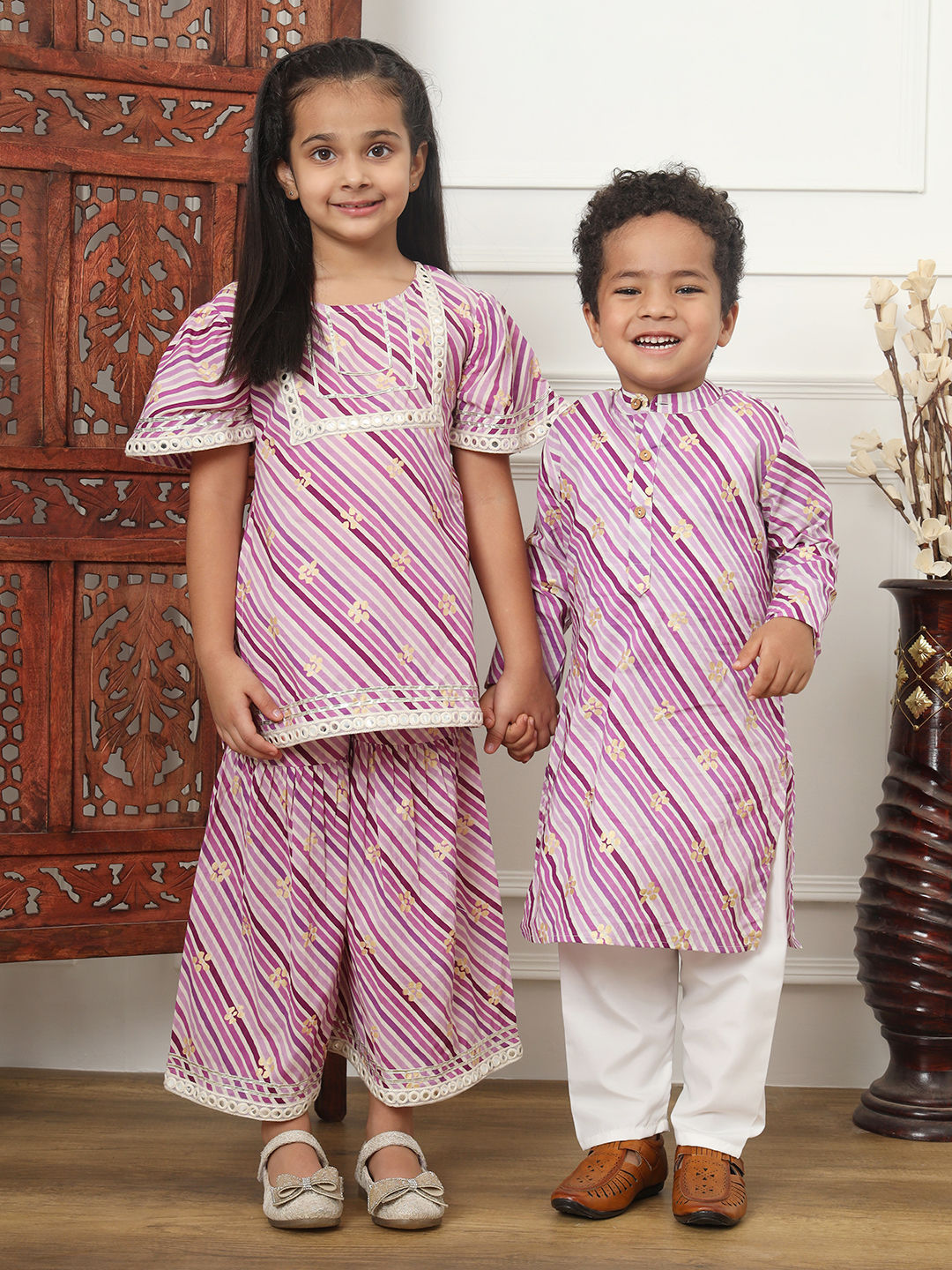 Description - Girls Straight Style Cotton Fabric Purple Color Leheriya Kurti And Sharara With Gotta And Mirror Lace Work