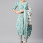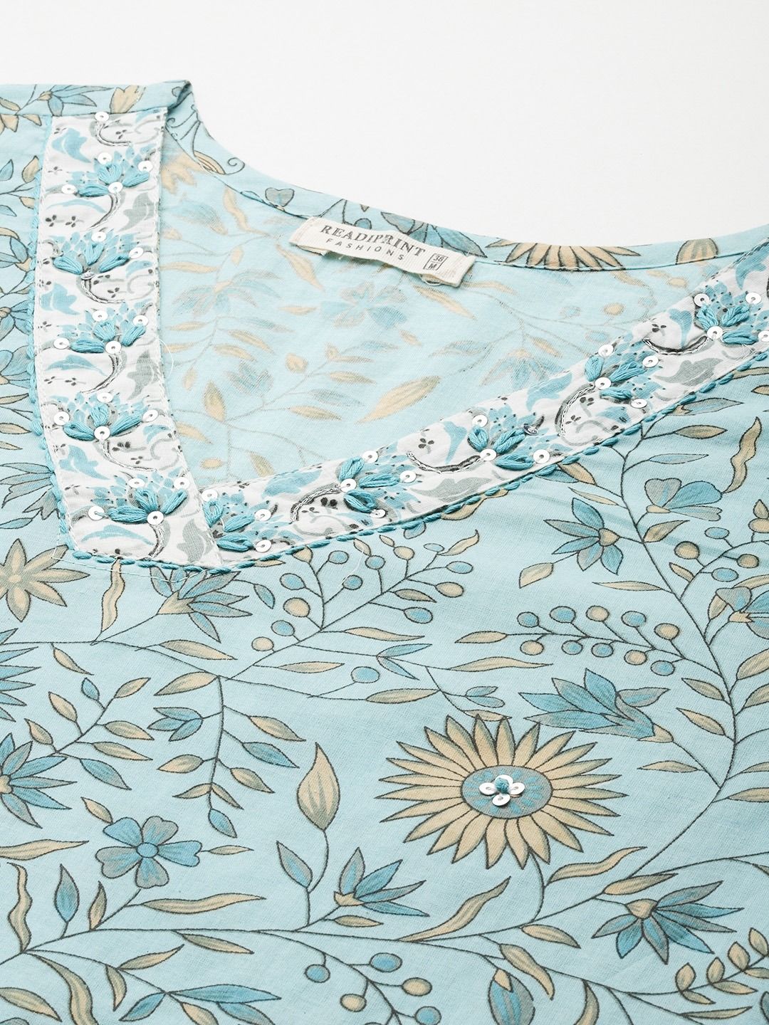 Description - Straight Style Cotton Fabric Blue Color Floral Printed Kurti With Sequence & Thread Work With Bottom & Dupatta