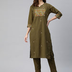 Straight Style Cotton Fabric Olive Green Color Kurti And Bottom