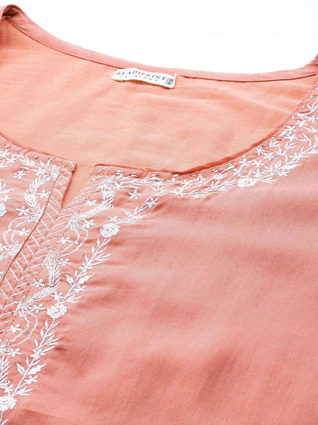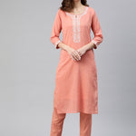Description - Straight Style Cotton Fabric Peach Color Kurti With Thread & Sequence Work With Bottom