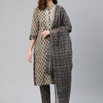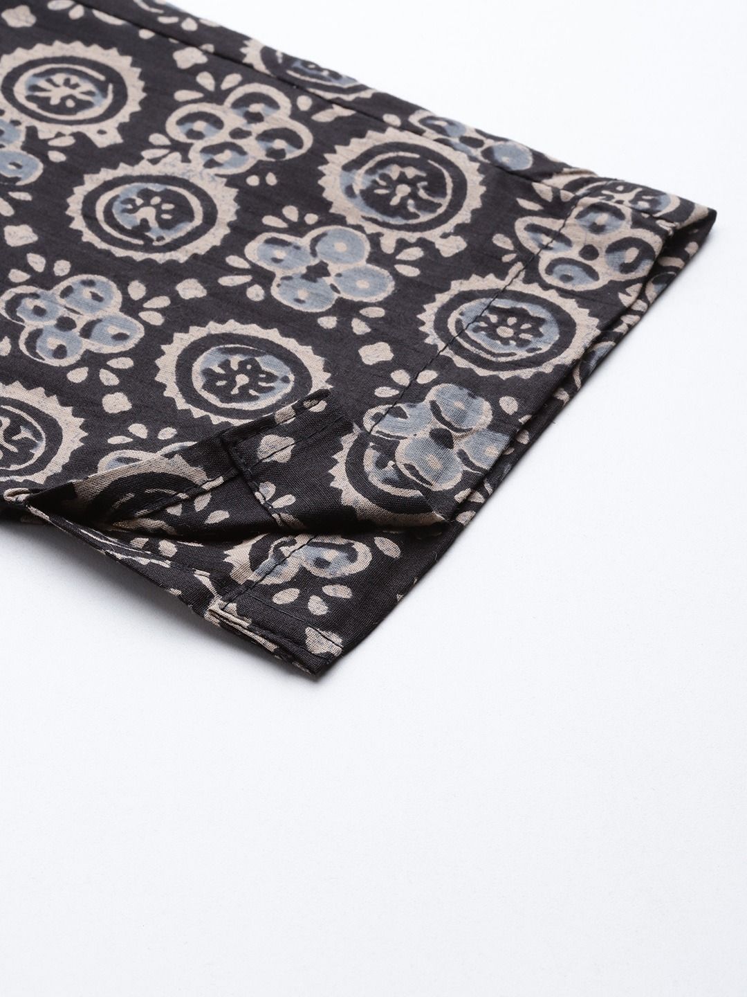 Description - Straight Style Cotton Fabric Black Color Floral Printed Kurti With Zari Work With Bottom & Dupatta