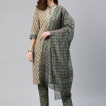 Description - Straight Style Cotton Fabric Green Color Floral Printed Kurti With Zari Work With Bottom & Dupatta