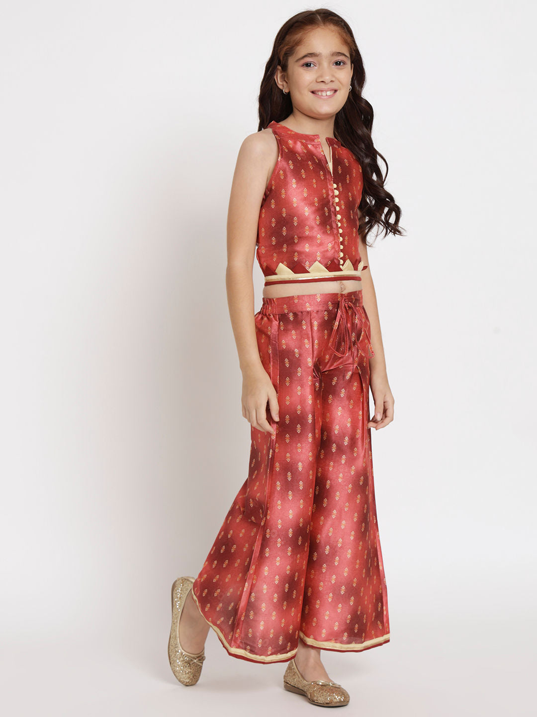 Description - Straight Style Chanderi Fabric Rust Color Printed Top And A Line Palazzo With Gotta Lace Work