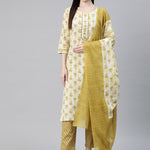 Straight Style Cotton Fabric Mustard Color Printed Kurti And Bottom With Dupatta