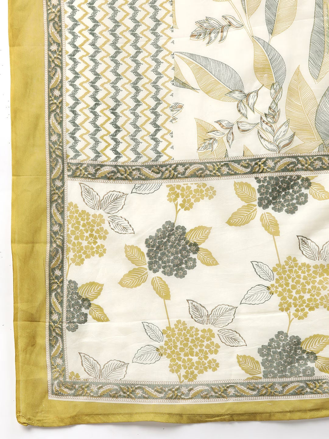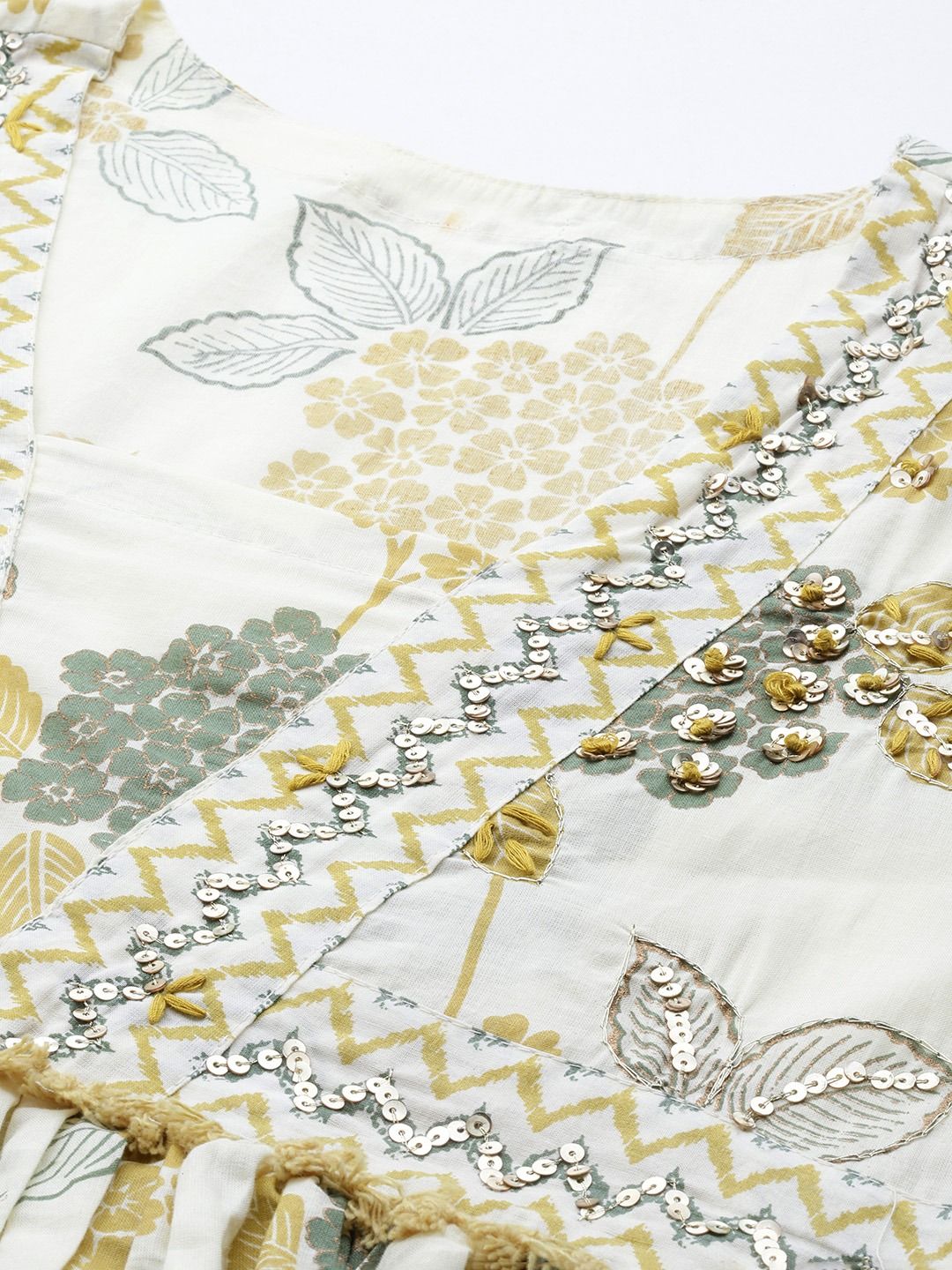 Description - Frock Style Cotton Fabric Green Color Floral Printed Kurti With Pyjama And Dupatta With Thread And Sequin Work