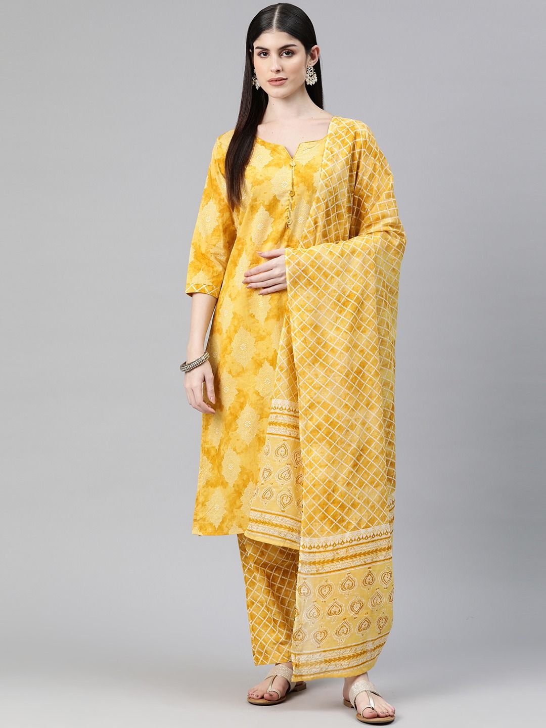 Description - Straight Style Cotton Fabric Yellow Color Floral Printed Kurti And Palazzo With Dupatta