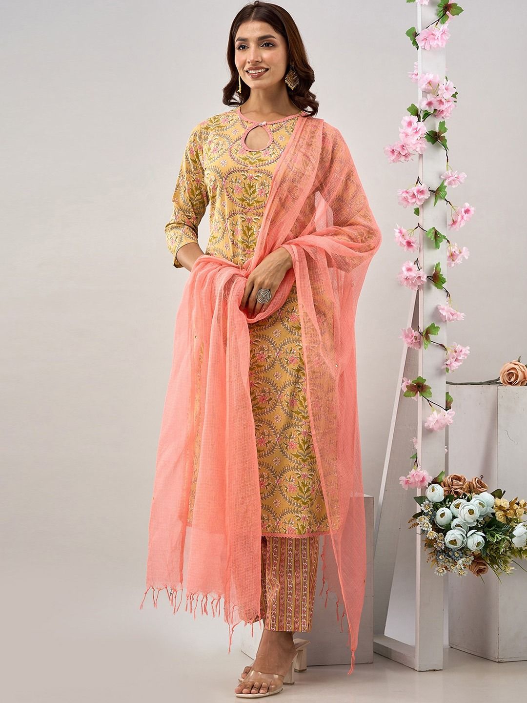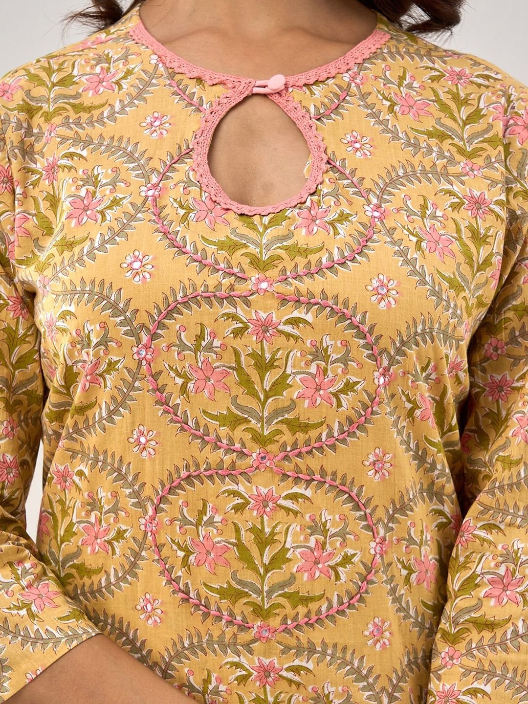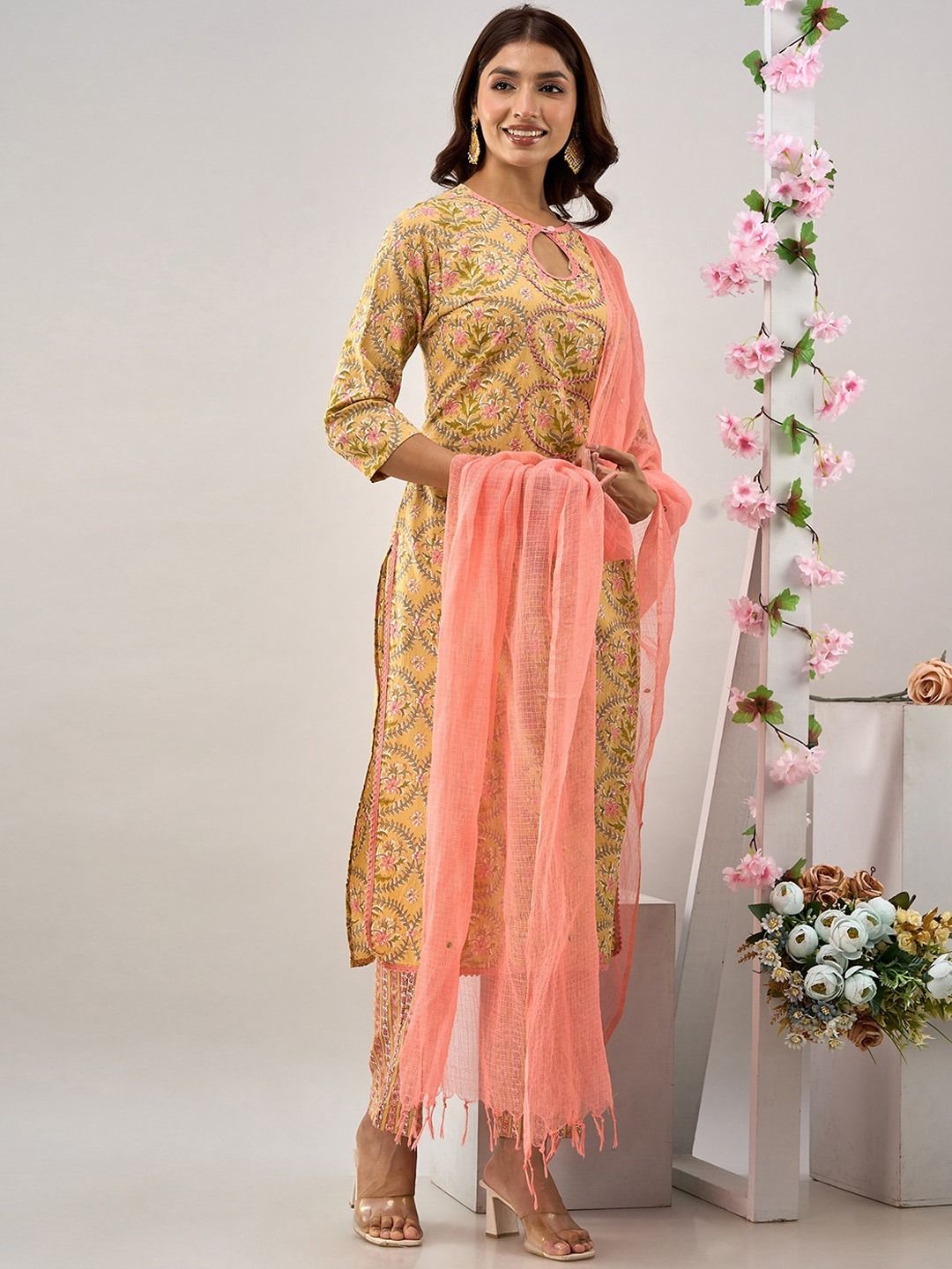 Description - Straight Style Cotton Fabric Yellow Color Printed Kurti With Thread & Mirror Work With Bottom & Dupatta
