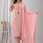 Description - Straight Style Cotton Fabric Pink Color Printed Kurti With Zari, Thread & Mirror Work With Bottom & Dupatta