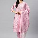 Straight Style Cotton Fabric Pink Color Kurti And Bottom With Dupatta