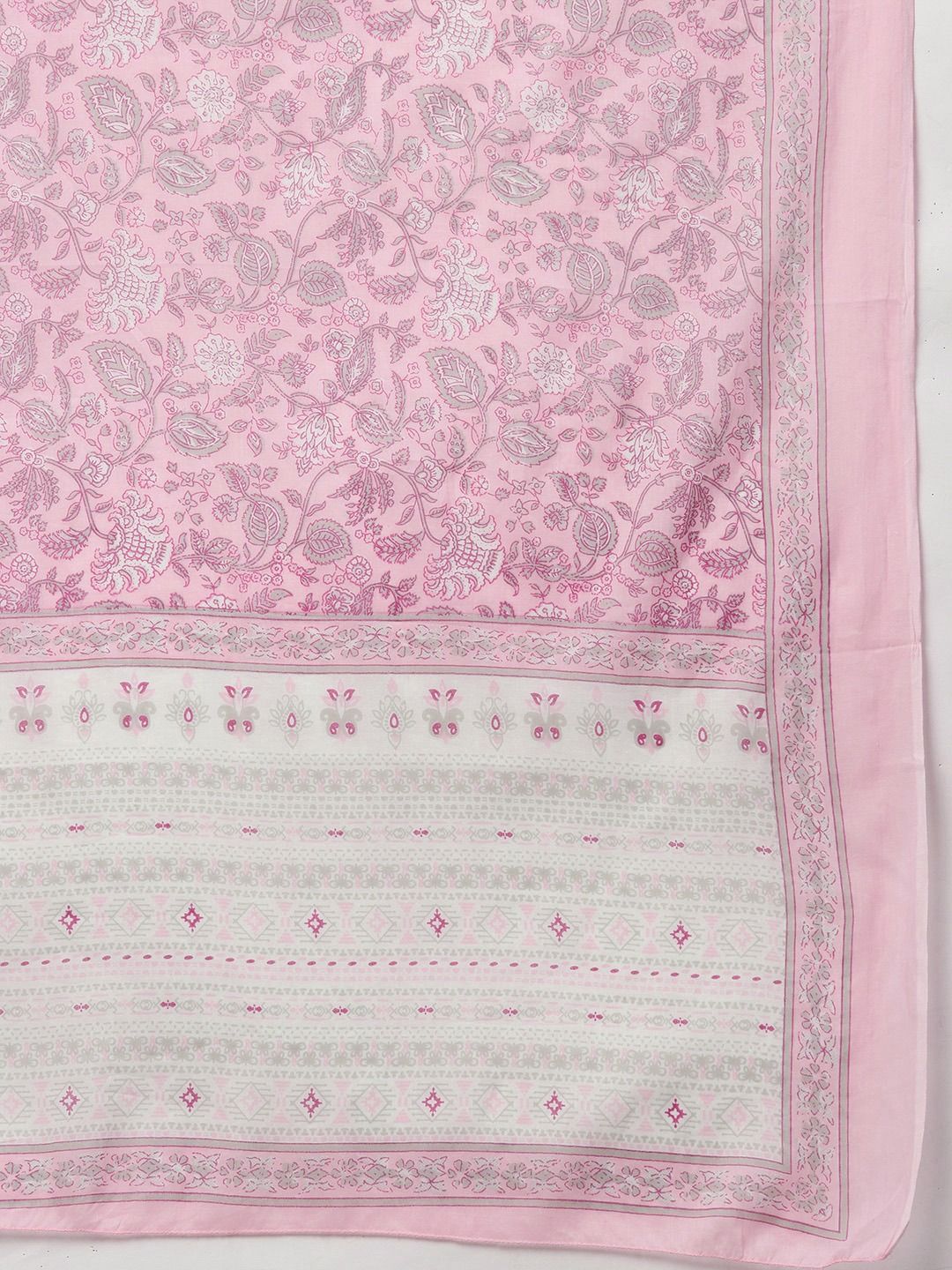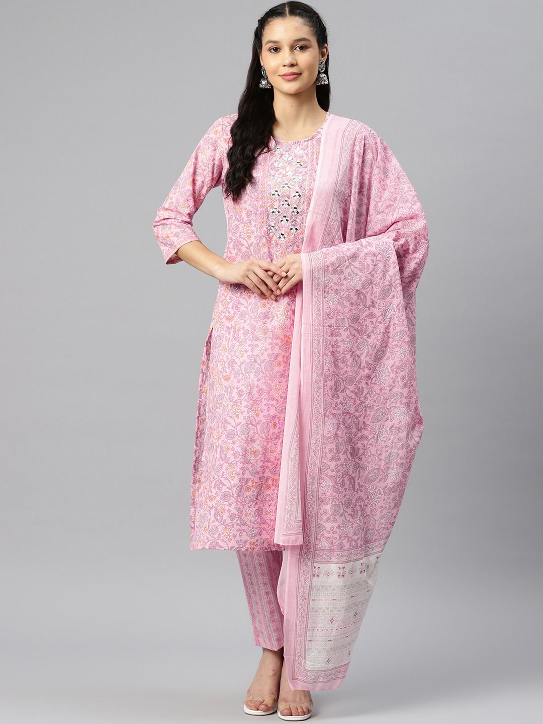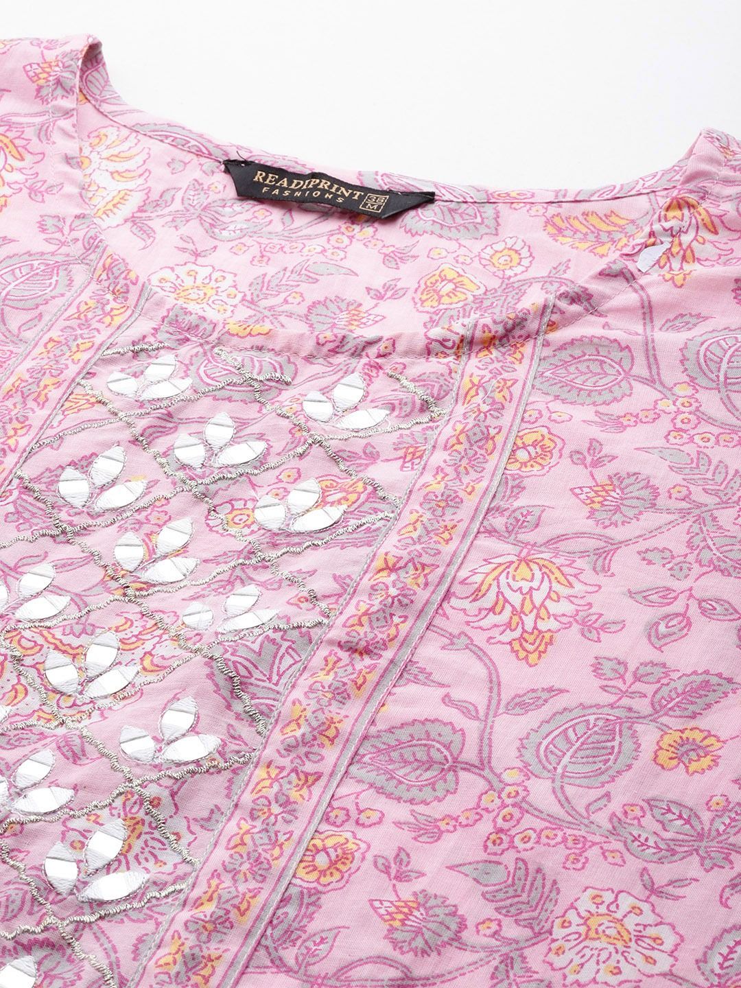 Description - Straight Style Cotton Fabric Pink Color Printed Kurti With Zari, Thread & Mirror Work With Bottom & Dupatta