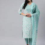 Straight Style Cotton Fabric Sea Green& White Color Kurti And Bottom With Dupatta