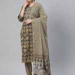 Description - Straight Style Cotton Fabric Printed Black Colour Kurta With Zari, Thread & Mirror Work With Bottom & Dupatta