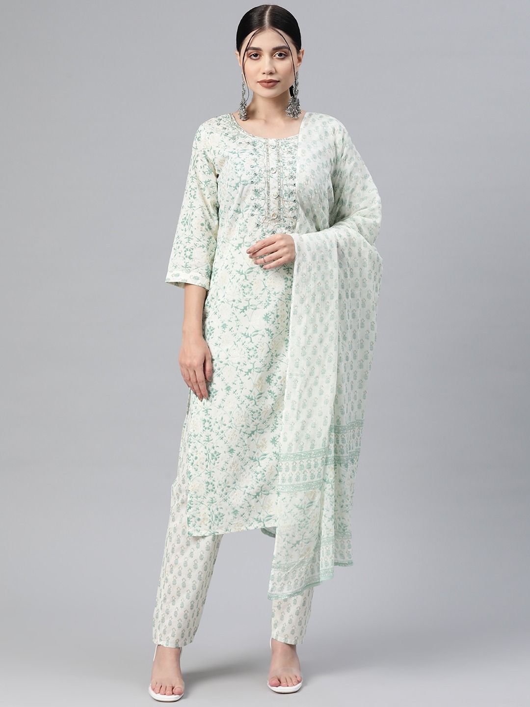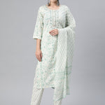 Straight Style Cotton Fabric Cream & Green Color Kurti And Bottom With Dupatta