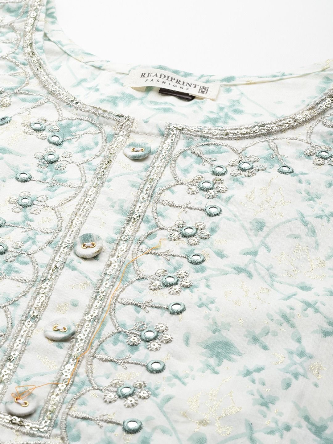 Description - Straight Style Cotton Fabric Green & Cream Colour Zari, Mirror & Thread Work Kurta With Palazzo & Dupatta