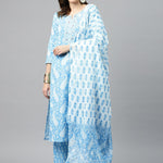 Straight Style Cotton Fabric Blue Color Kurta And Bottom With Dupatta