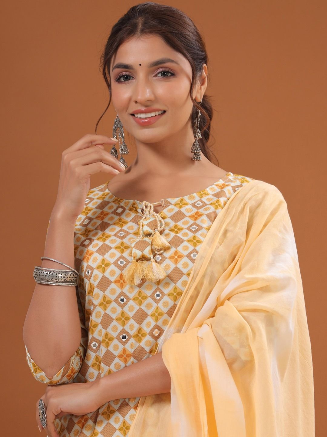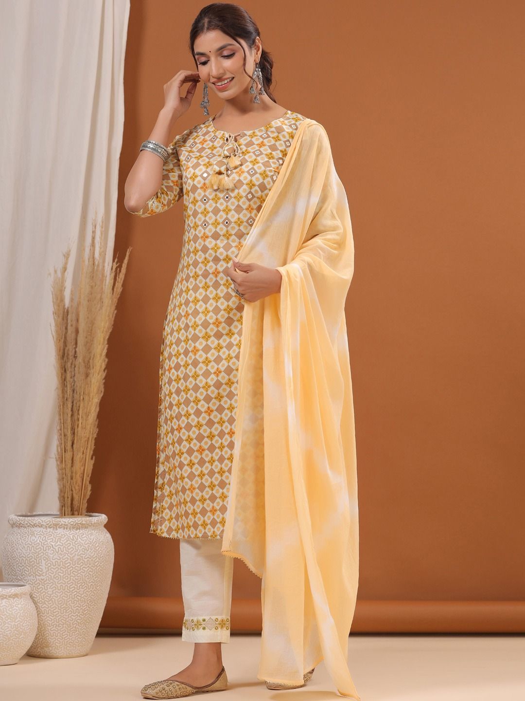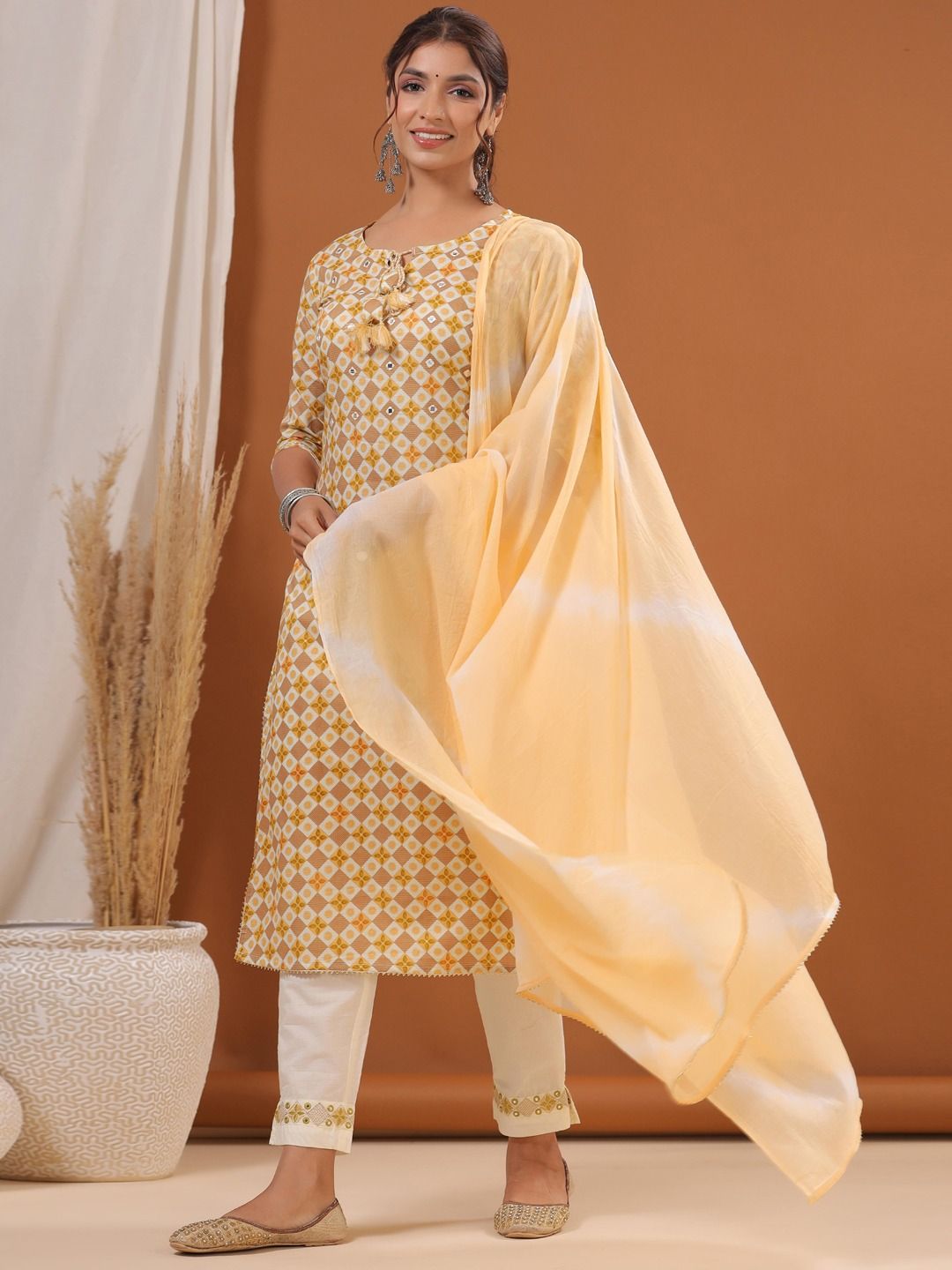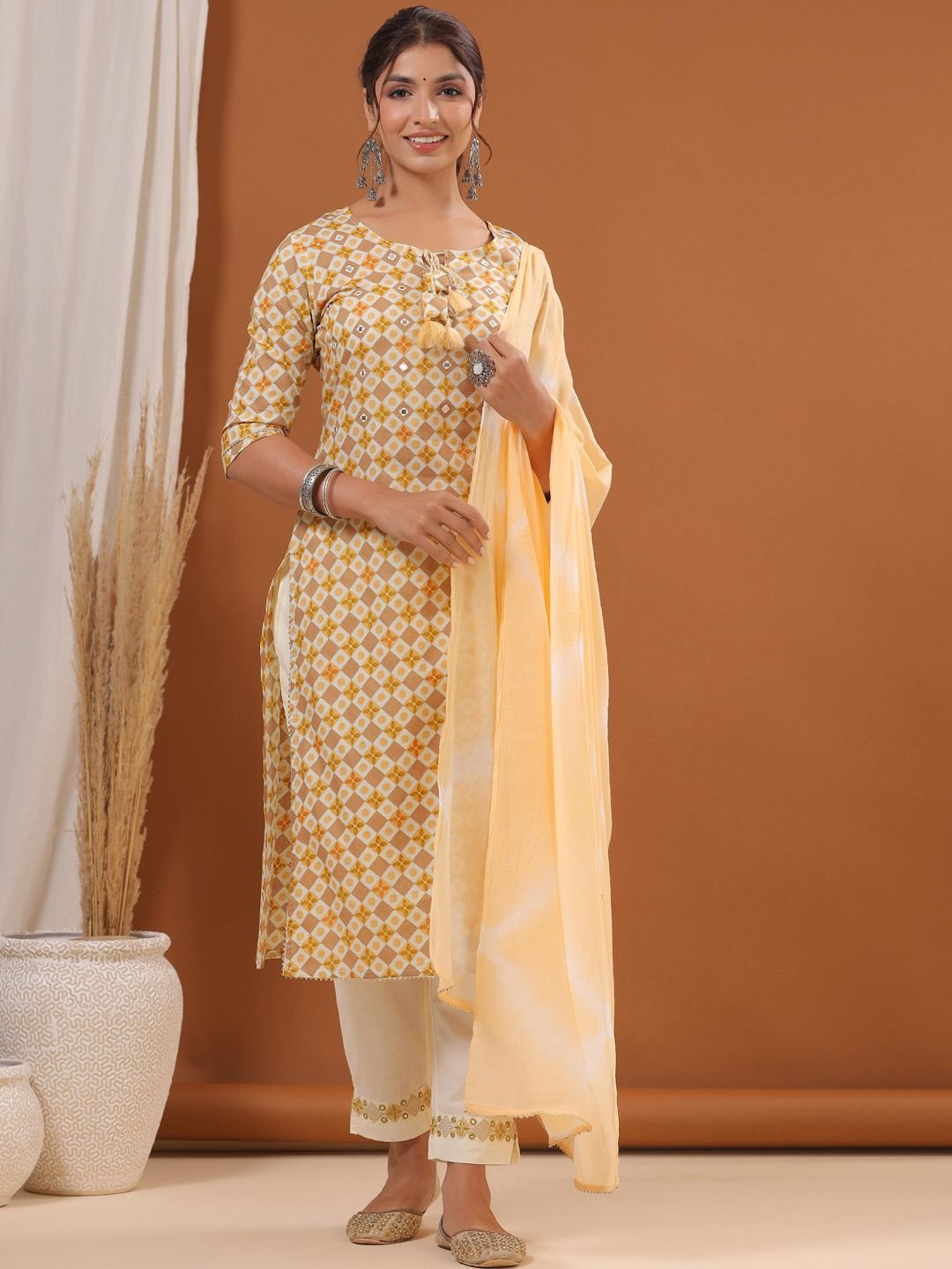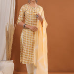 Description - Straight Style Cotton Fabric Yellow Color Printed Kurti With Thread & Mirror Work With Bottom & Dupatta