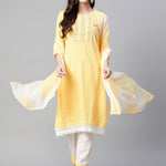 Description - Straight Style Cotton Fabric Yellow Color Embroidered Kurta With Thread Work With Bottom & Dupatta