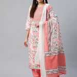 Straight Style Cotton Fabric White & Pink Color Kurta With Bottom With Dupatta