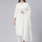 Straight Style Cotton Fabric White Color Kurta With Bottom & Dupatta