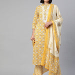 Straight Style Cotton Fabric Mustard Color Kurta With Bottom & Dupatta