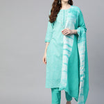 Straight Style Cotton Fabric Sea Green Color Kurta With Bottom & Dupatta