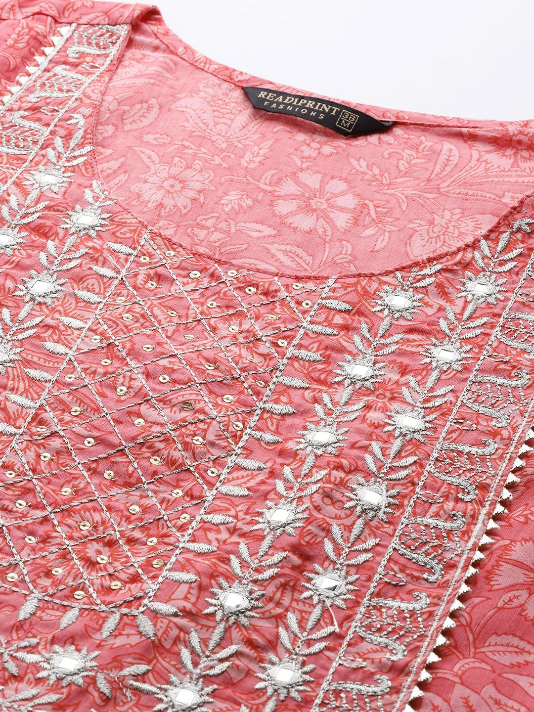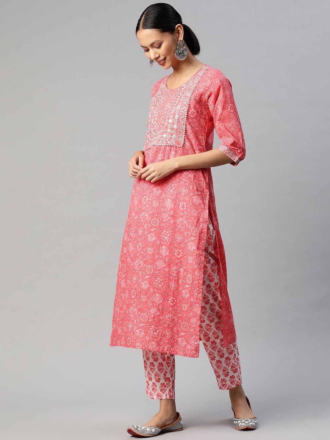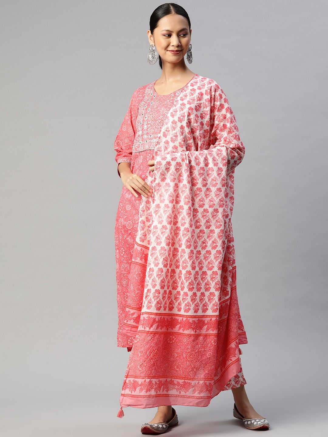 Description - Straight Style Cotton Fabric Pink Colour Printed Kurta With Embroidery & Mirror Work At Neck Line And Printed Bottom & Dupatta