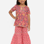 Description - A Line Gathered Cotton Fabric Pink Color Floral Printed Kurta With Printed Sharara With Goat Work