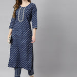 Cotton Fabric Blue Color Straight Style Printed Kurta & Bottom