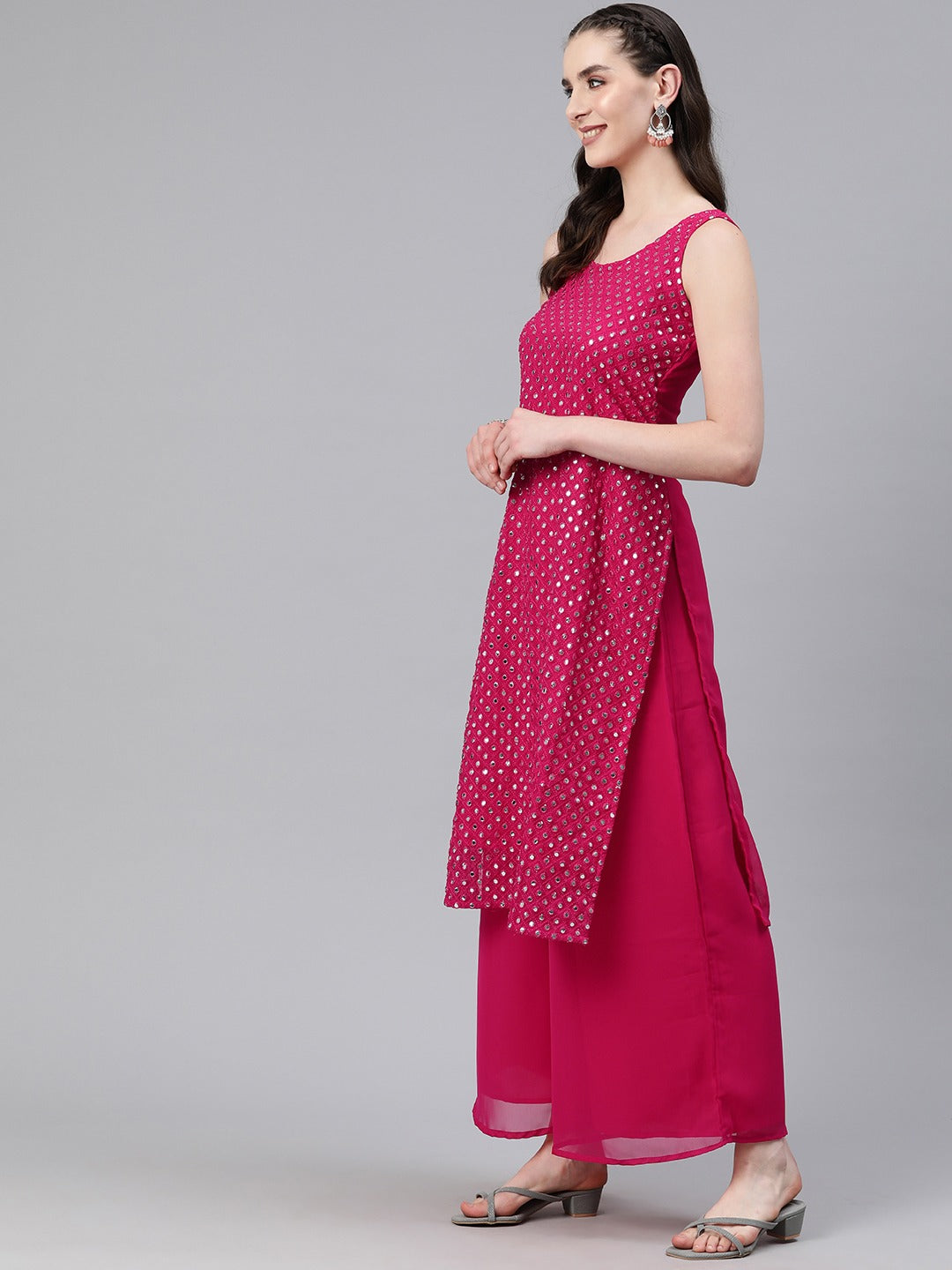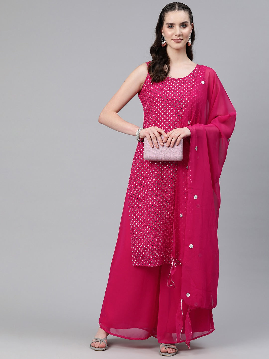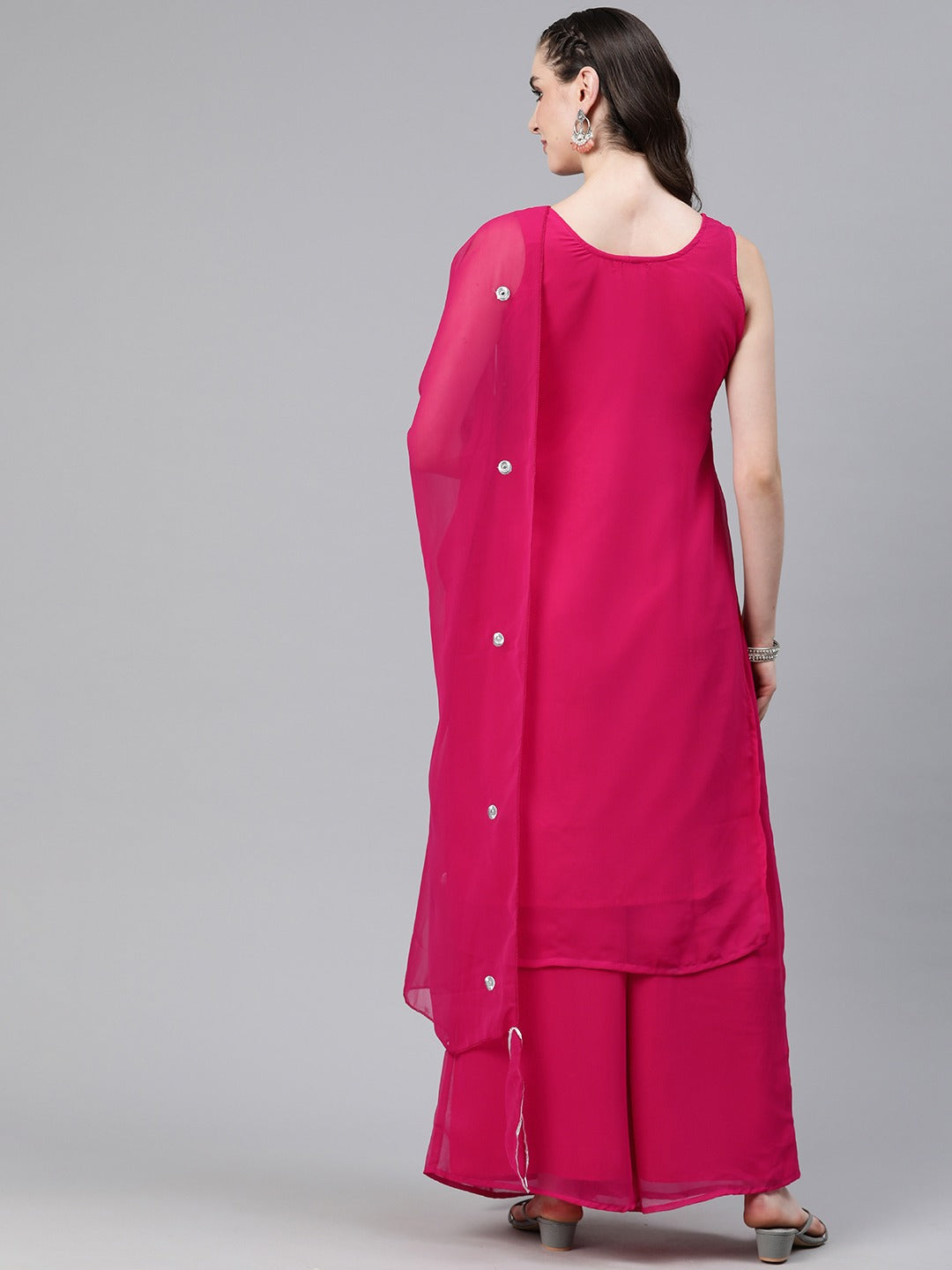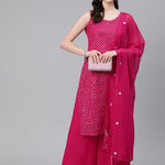 Straight Style Georgette Fabric Magenta Color Kurti And Bottom & Dupatta