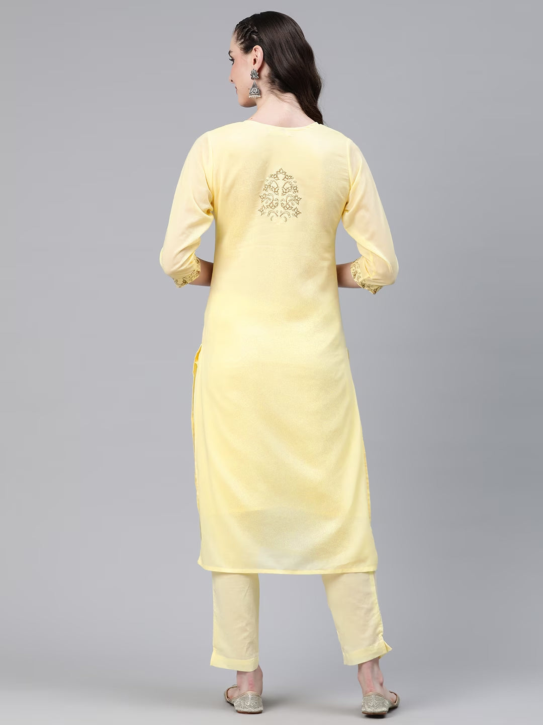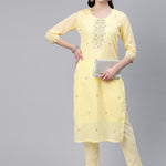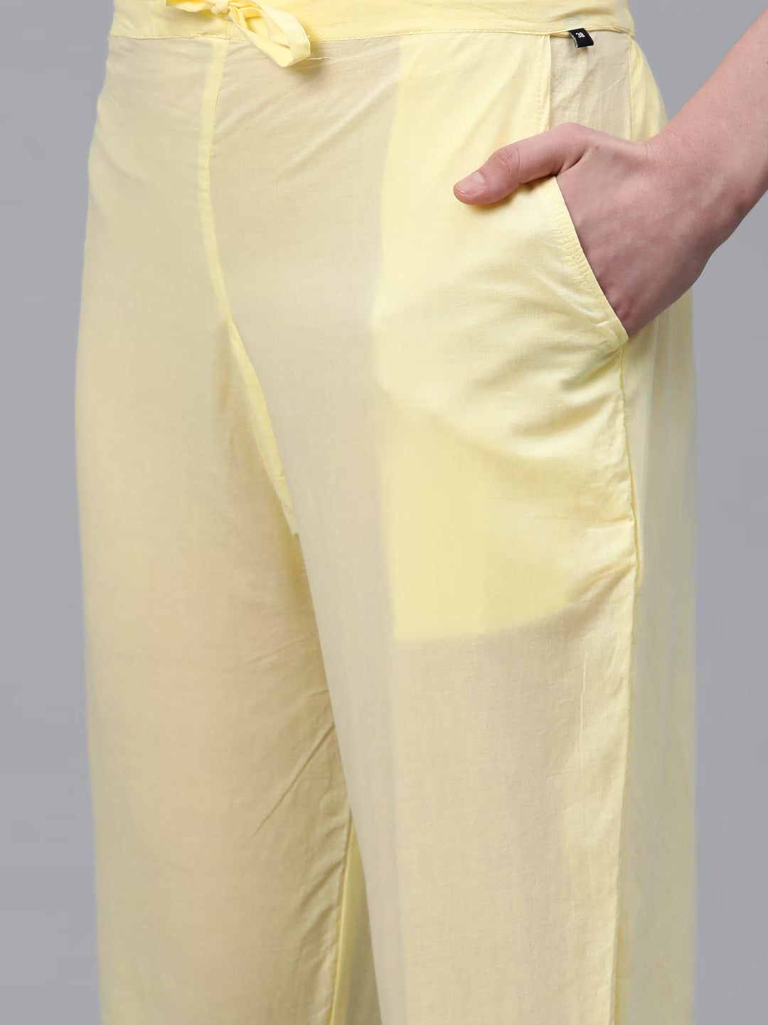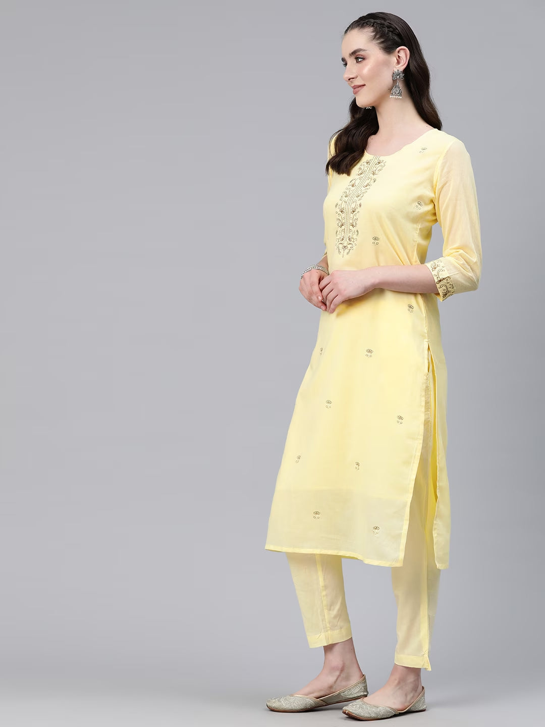 Straight Style Cotton Fabric Yellow Color Kurti And Bottom