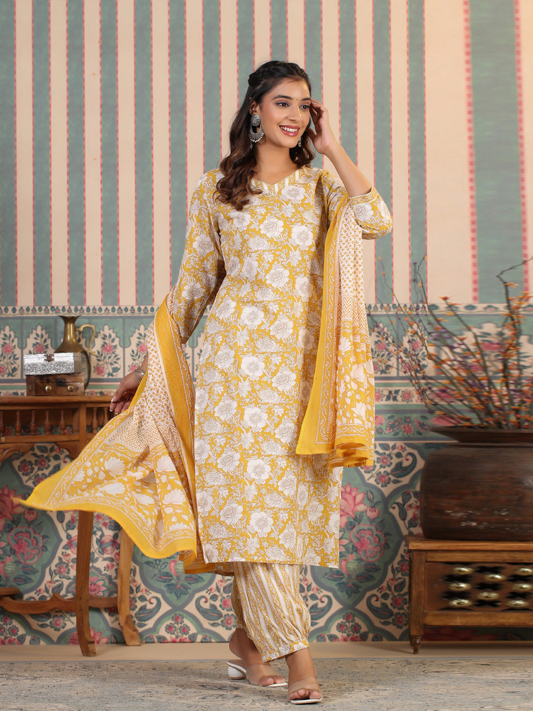 Straight Style Cotton Fabric Mustard Color Kurta And Bottom With Dupatta