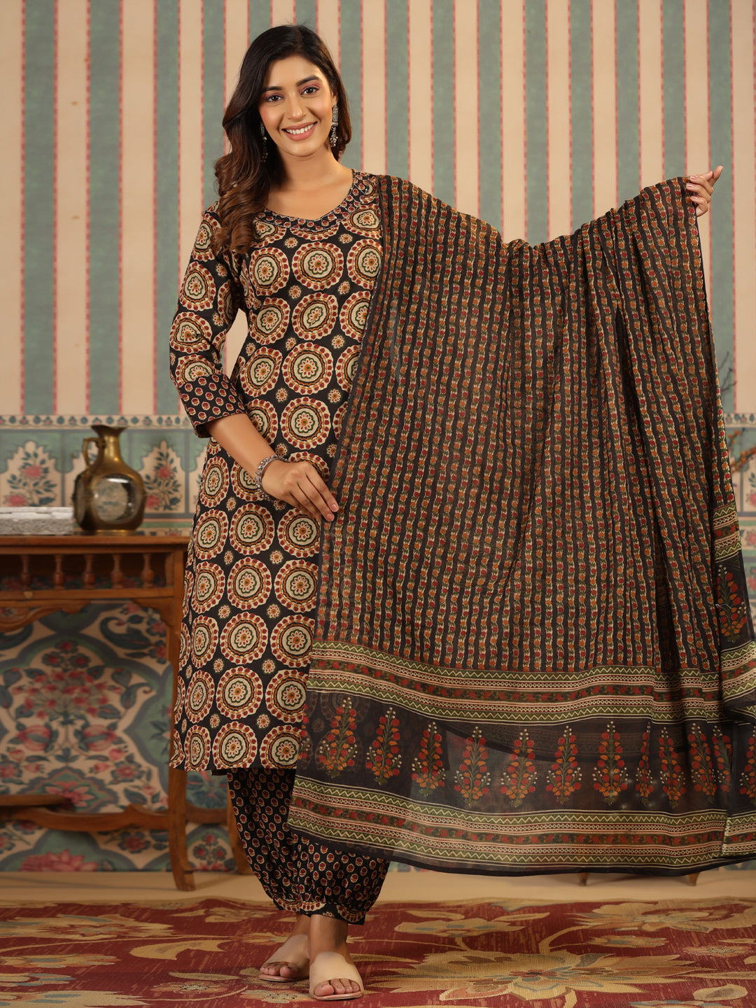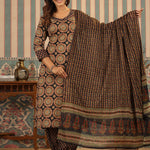 Straight Style Cotton Fabric Black Color Kurta And Bottom With Dupatta