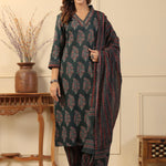 Straight Style Cotton Fabric Green Color Kurta And Bottom With Dupatta