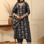 Straight Style Cotton Fabric Black Color Kurta And Bottom With Dupatta