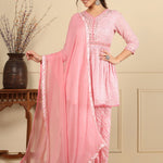 Flared Style Mulmul Cotton Fabric Pink Color Kurta And Bottom With Dupatta