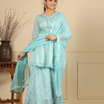 Flared Style Mulmul Cotton Fabric Blue Color Kurta And Bottom With Dupatta