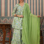 Flared Style Mulmul Cotton Fabric Green Color Kurta And Sharara With Dupatta