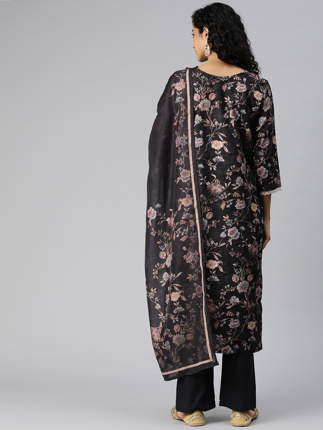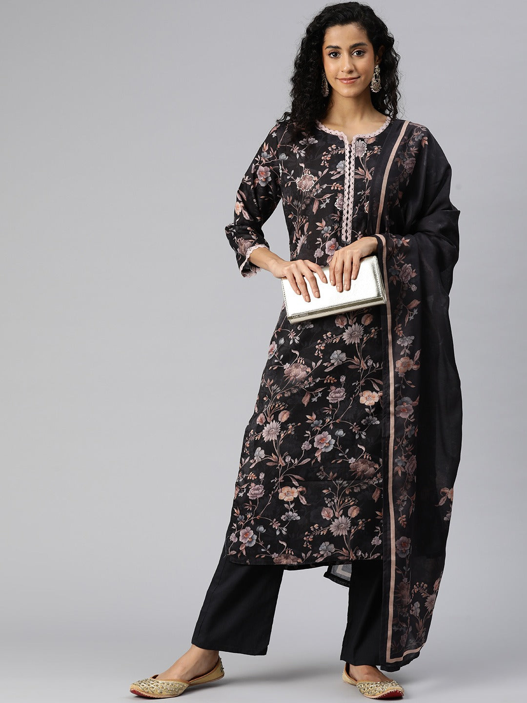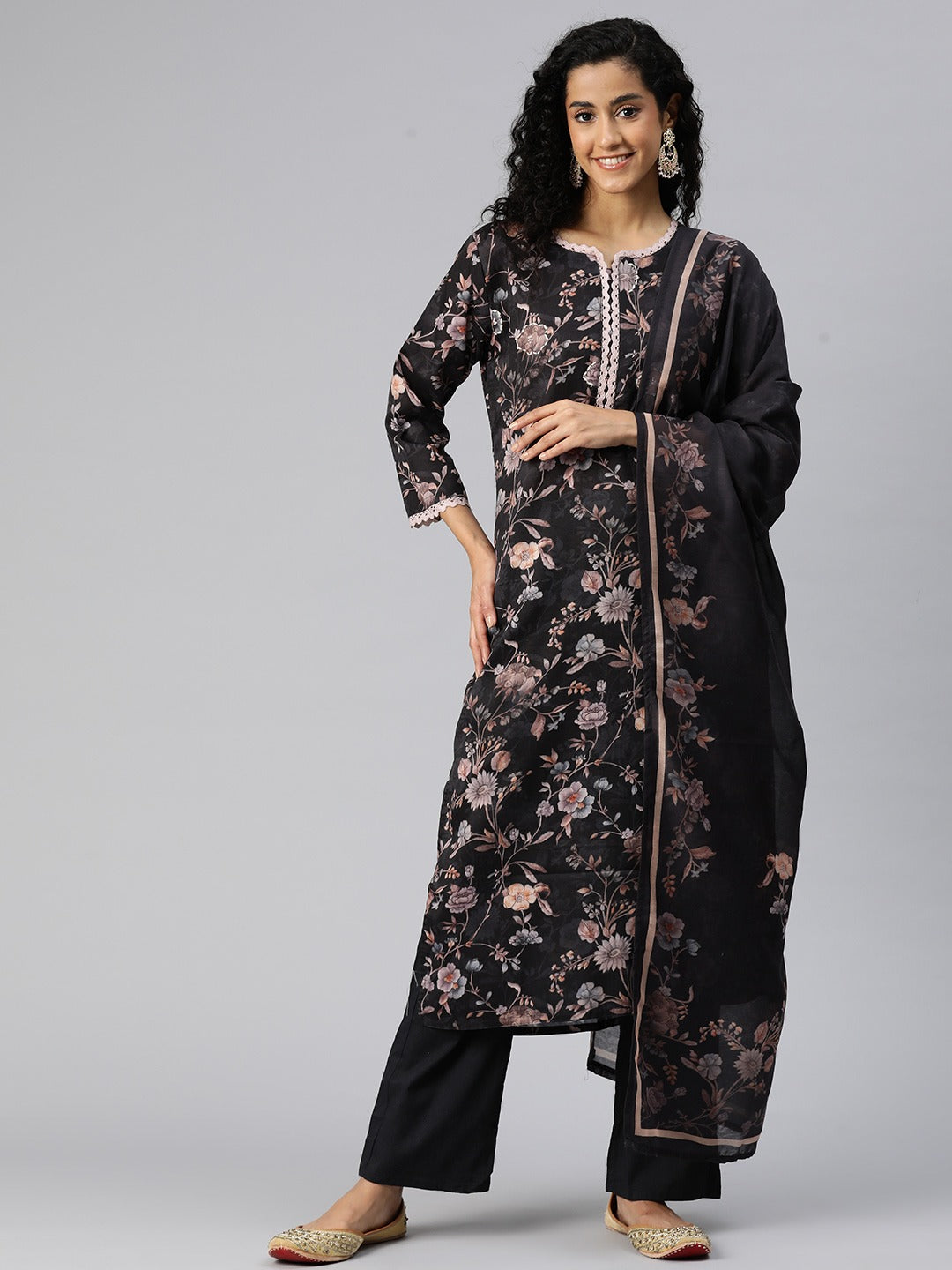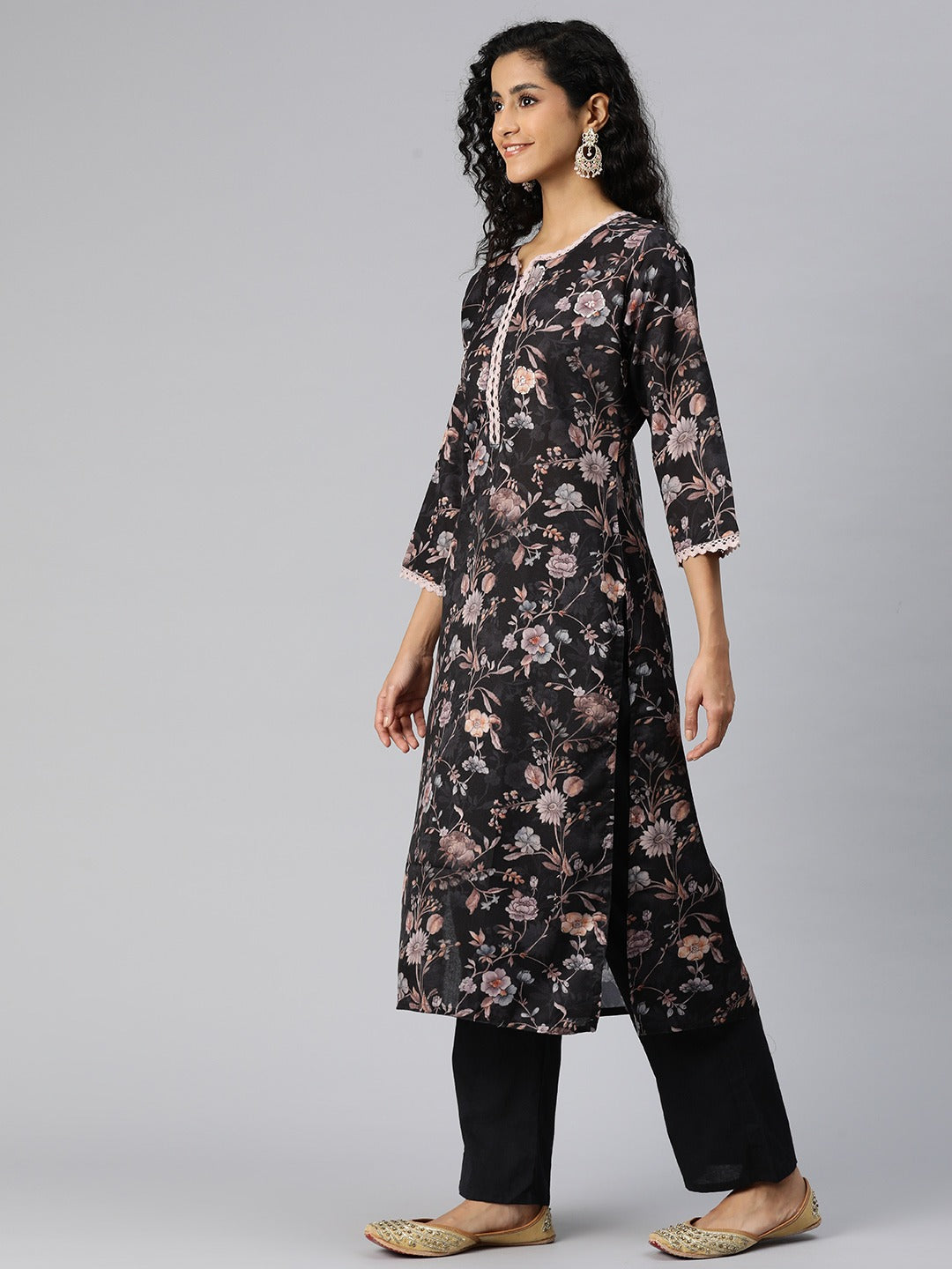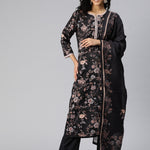 Straight Style Cotton Fabric Black Color Kurta And Bottom With Dupatta