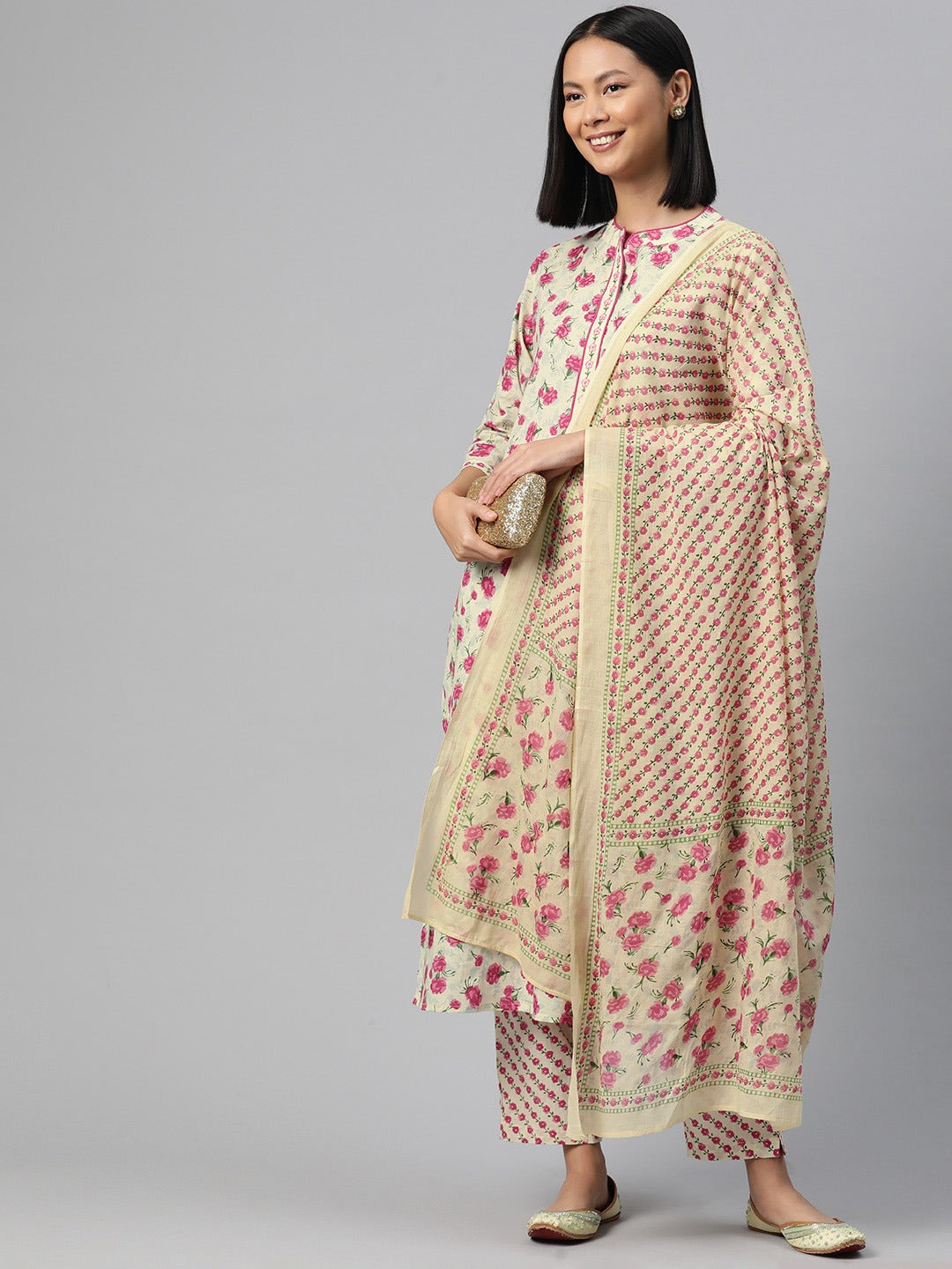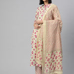 Straight Style Cotton Fabric Cream Color Kurti And Bottom With Dupatta