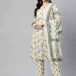 Straight Style Cotton Fabric Green Color Kurta And Bottom With Dupatta