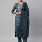 Straight Style Cotton Fabric Grey Color Kurta And Bottom With Dupatta