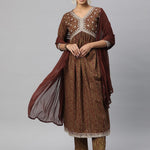 Flared Style Cotton Fabric Brown Color Kurta And Bottom With Dupatta