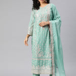 Pakistani Style Organza Fabric Sea Green Color Kurti With Bottom And Dupatta