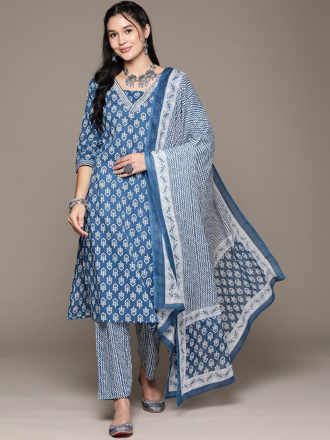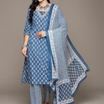 Straight Style Cotton Fabric Blue Color Kurta With Bottom And Dupatta