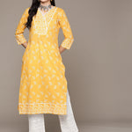 Straight Style Cotton Fabric Yellow Color Kurta With Bottom