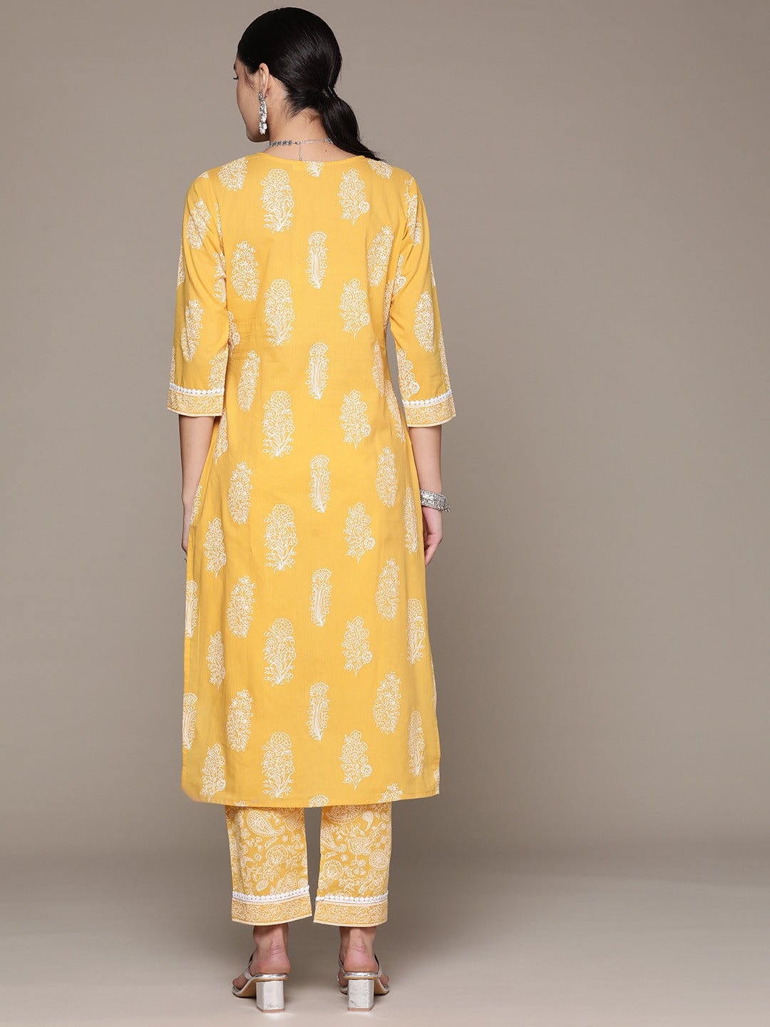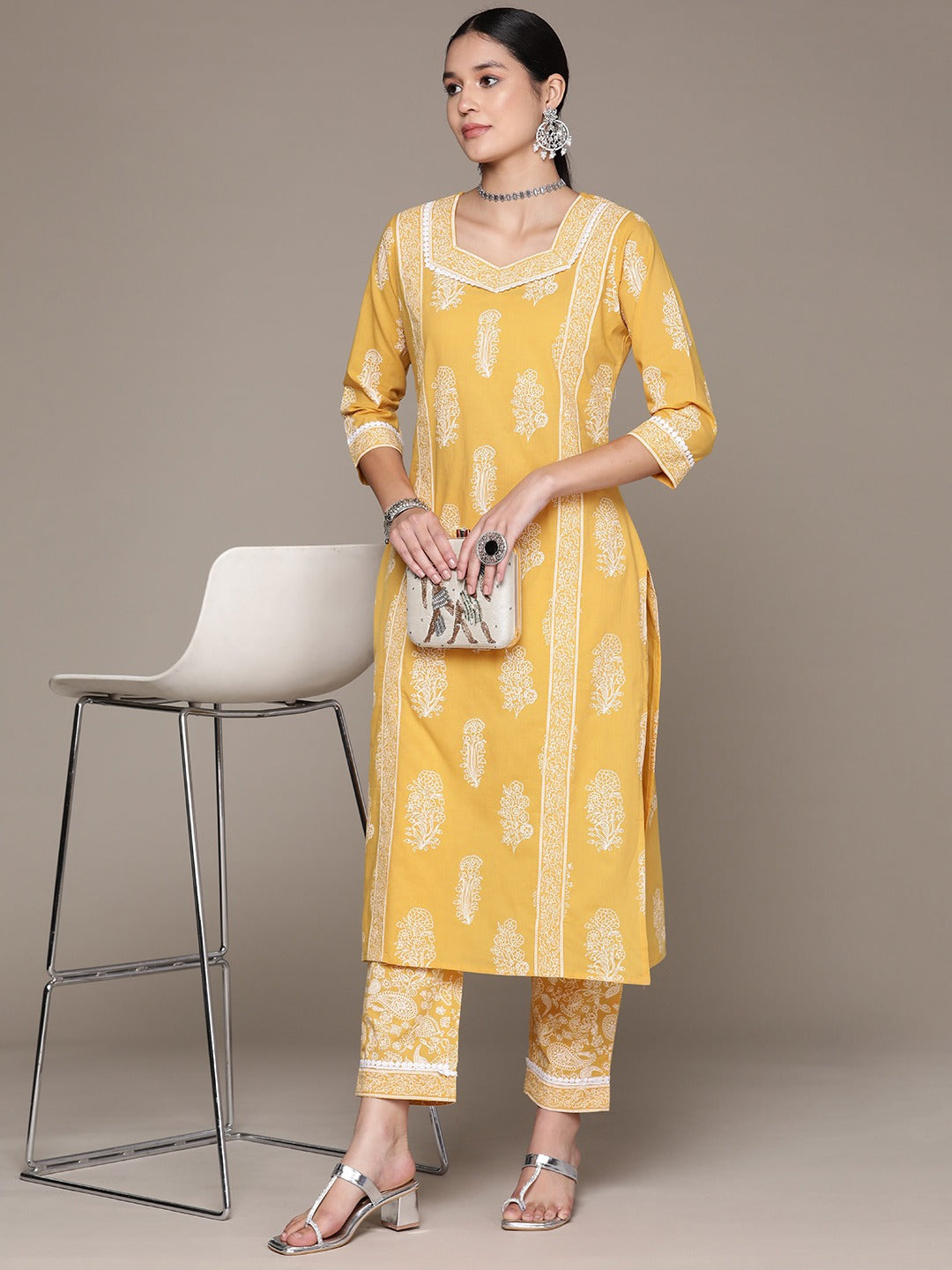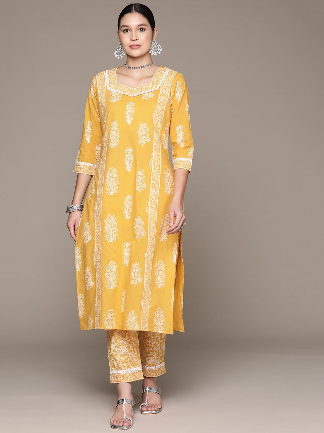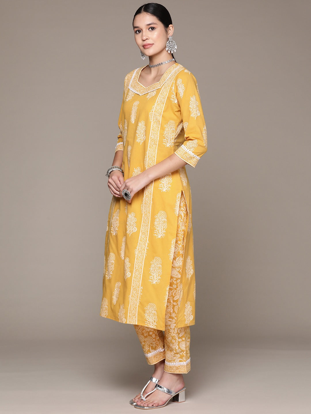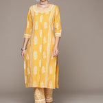 Straight Style Cotton Fabric Yellow Color Kurta With Bottom