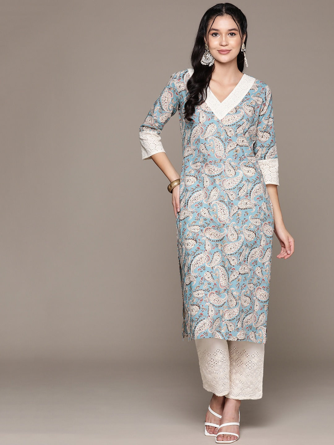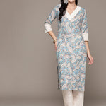 Straight Style Cotton Fabric Blue Color Kurta With Bottom
