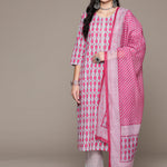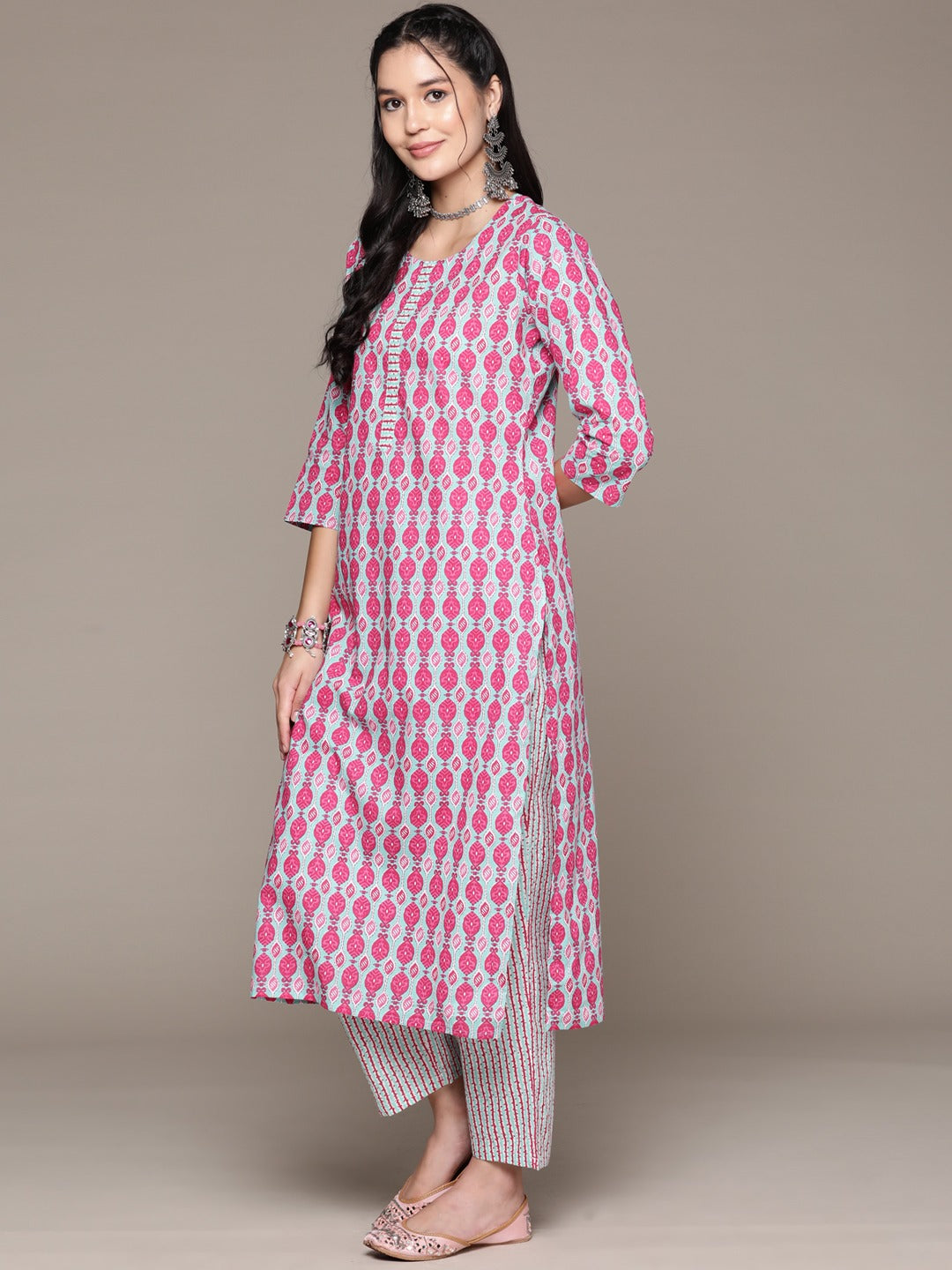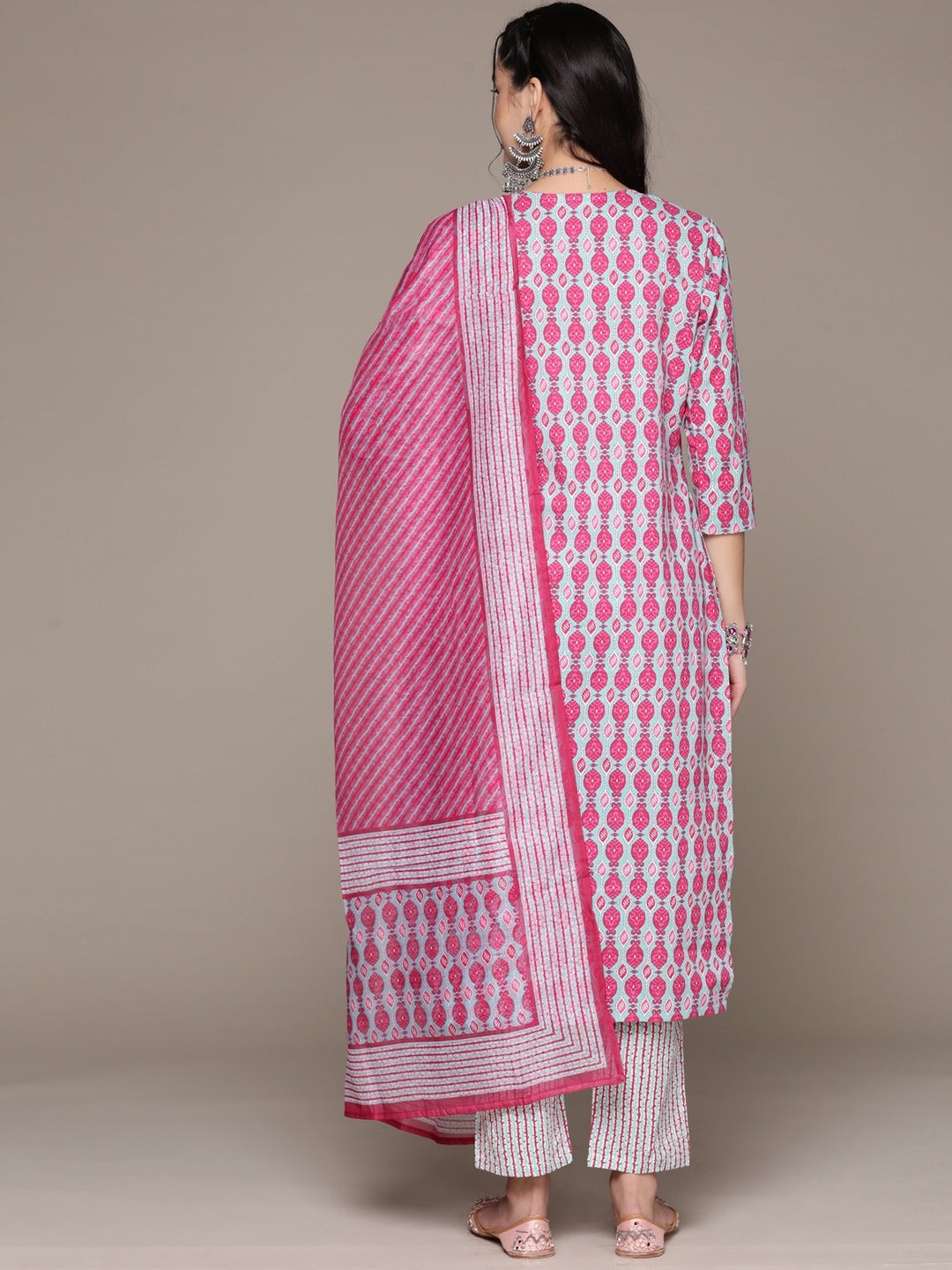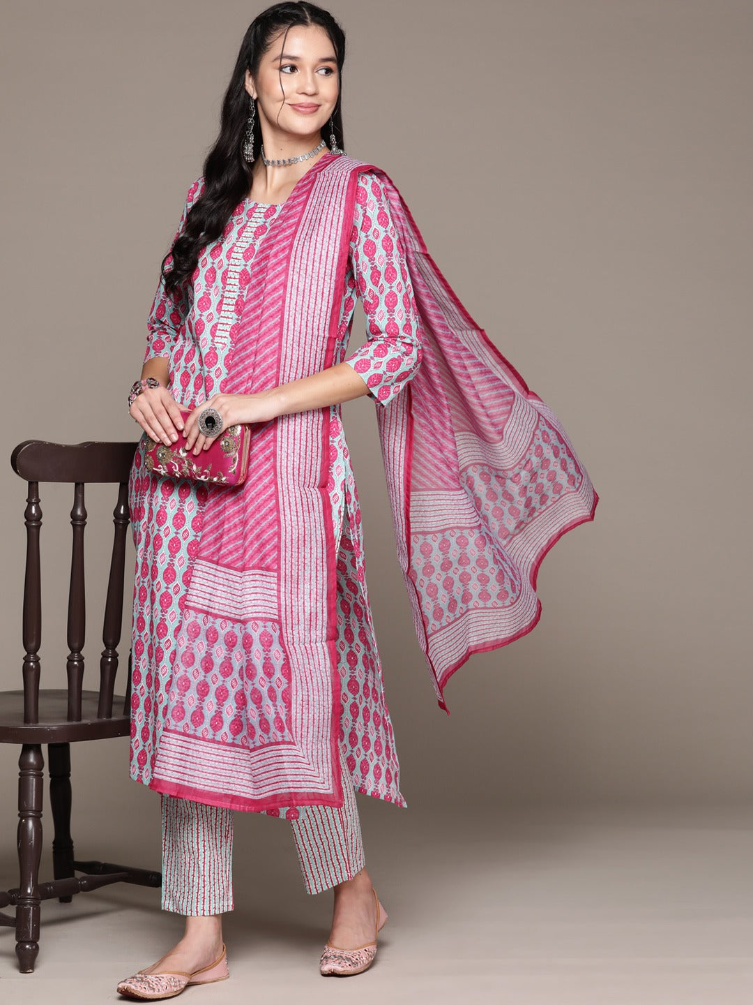 Straight Style Cotton Fabric Turquoise Blue Color Kurta With Bottom And Dupatta