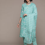 Straight style cotton fabric Sea green color kurta with Bottom and dupatta