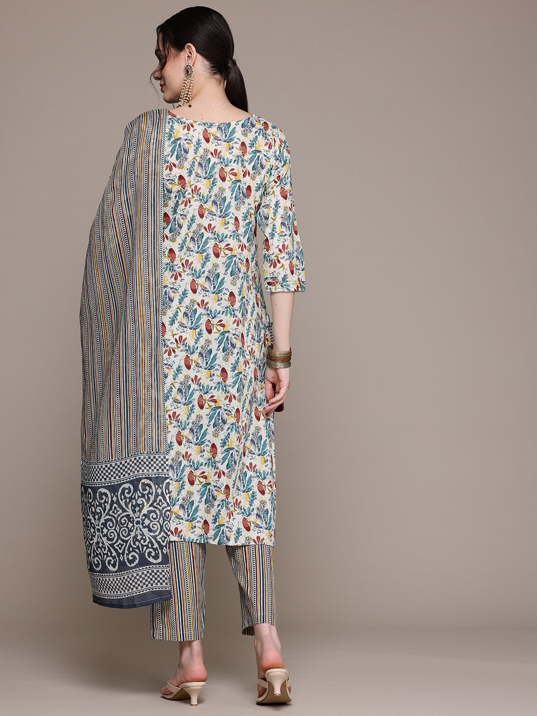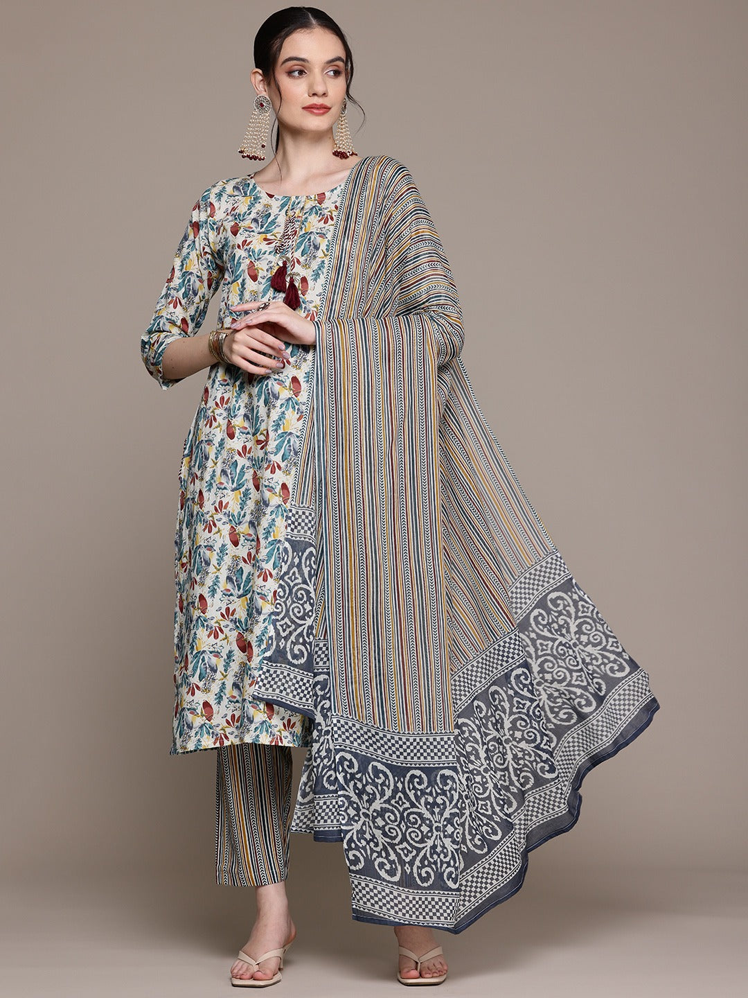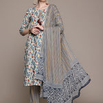 Straight Style Cotton Fabric Multi Color Kurta With Bottom And Dupatta